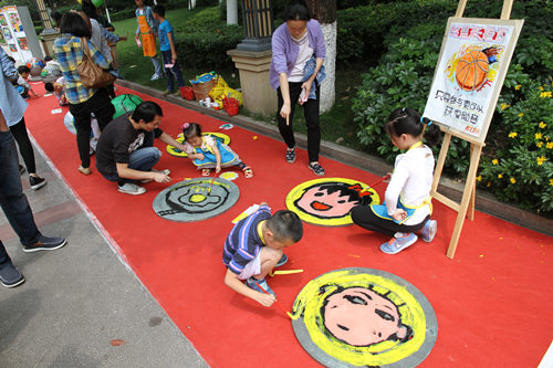 5月28日(星期六),活動(dòng)于13:30準時(shí)開(kāi)始,雖然驕陽(yáng)似火,但也阻擋不住小朋友們快樂(lè )的心情,一只只興奮的“小蝴蝶”迅速地飛向各項游戲中去,有詞語(yǔ)接龍,沙瓶畫(huà),蛋糕分享,兩人三足、涂鴉繪制等游戲???,在彩繪長(cháng)絹中,小朋友們各自選中自己喜歡的圖案,盡情想,勾勒出五彩斑斕的圖案。最有特色的要數在石墩和窨井蓋上面作畫(huà)了,有的在上面畫(huà)了一個(gè)大西瓜,有的畫(huà)出調皮可愛(ài)的大嘴猴,看著(zhù)這些活靈活現的彩圖,我們也被大院道亮麗的風(fēng)景線(xiàn)感染。