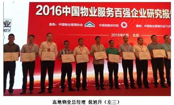 6月21日,由中國指數研究院和中國物業(yè)管理協(xié)會(huì )共同主辦的“2016中國物業(yè)服務(wù)百強企業(yè)研究報告發(fā)布會(huì )”在北京珠三角JW萬(wàn)豪酒店召開(kāi)。2016年,中國指數研究院和中國物業(yè)管理協(xié)會(huì )共同成立“中國物業(yè)管理行業(yè)TOP100研究組”,運用科學(xué)的評價(jià)方法和指標體系,對中國優(yōu)秀物業(yè)服務(wù)企業(yè)進(jìn)行了系統研究,形成了2016中國物業(yè)服務(wù)百強企業(yè)研究報告。大會(huì )表彰了物業(yè)服務(wù)優(yōu)秀企業(yè), 高地物業(yè)憑借優(yōu)秀的表現,位列“2016中國物業(yè)服務(wù)百強企業(yè)”第37位。