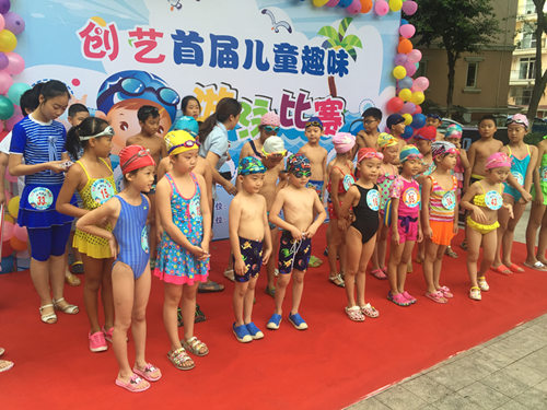 來(lái)自創(chuàng )藝物業(yè)管轄物業(yè)小區的的“中華園、中華家園、中華名園、中華錦繡、西城錦繡”等多個(gè)小區近50名參賽小選手匯聚在池邊,個(gè)個(gè)小朋友的臉上都洋溢著(zhù)歡樂(lè )喜悅,他們有的相互嘻戲打鬧;有的迫不及待的換上了比賽服;有的觀(guān)看著(zhù)被裝扮得五顏六色的比賽場(chǎng)地;更有的迫不急待地下池戲水了……