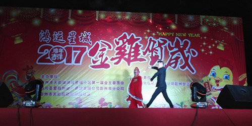 新春佳節之際,為搭建業(yè)主之間相互交流溝通平臺,營(yíng)造團結奮進(jìn)、文明和諧、喜慶祥和的小區氛圍,四川圣愛(ài)融創(chuàng )資產(chǎn)管理有限公司于2017年1月14日在廣安“廣安國際商業(yè)中心”小區、1月19日、1月20日在雙流“錦繡華都”、“弘民新城”小區、1月20日在彭州“鴻運星城”小區、1月22日在德陽(yáng)“印象戛納”小區舉辦了大型以“喜猴呈祥家家樂(lè ) 金雞兆瑞步步高”、“聞雞起舞”為主題的迎春晚會(huì )。演藝公司和各小區文藝積極分子共同為業(yè)主呈現了一臺臺精彩紛呈,令人難忘的晚會(huì )。