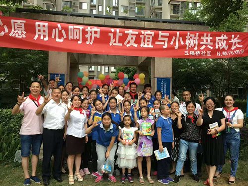 活動(dòng)分為四部分:兒童作品展、文藝演出、集體繪畫(huà)和種植友誼樹(shù)。作品展作品豐富,有特殊兒童的刺繡、漆器作品以及社區兒童繪畫(huà),每一幅作品都是精心制作,獲得了現場(chǎng)觀(guān)眾一致好評。文藝演出精彩不斷,手語(yǔ)老師現場(chǎng)教學(xué)手語(yǔ)表達節日祝福,朗誦節目《媽媽》撥動(dòng)觀(guān)眾心弦,一曲竹笛《紅高粱》更是驚艷全場(chǎng);集體繪畫(huà),小朋友或跪、或趴,用五顏六色的彩筆在主題為“我愛(ài)成都,幸福家園”的畫(huà)板上描畫(huà)心中美好家園。最后,小朋友兩兩結對,在鎦金歲月的噴水池旁種植友誼之樹(shù)?;顒?dòng)結束時(shí),華瑋物業(yè)負責人為小朋友贈上課外讀本并合影留戀。