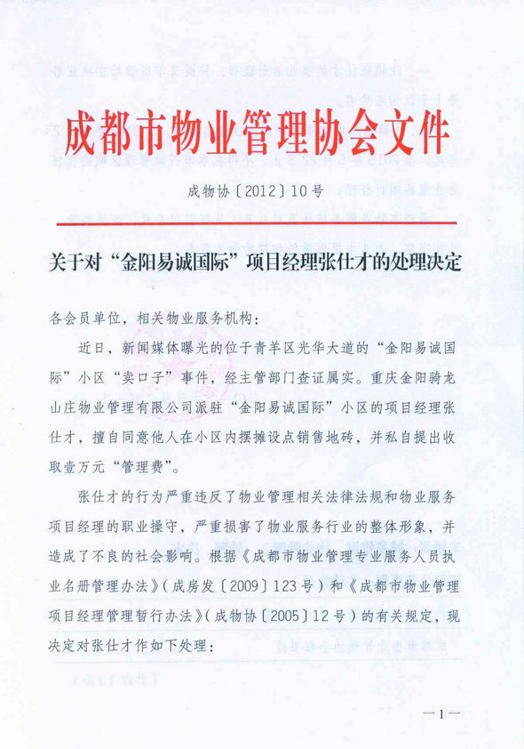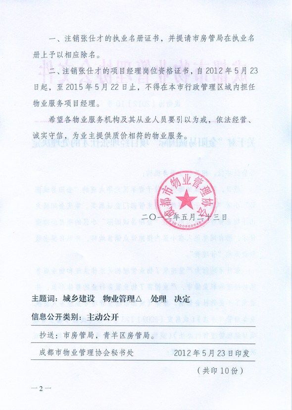 上一條:關(guān)于對張仕才從成都市物業(yè)管理專(zhuān)業(yè)服務(wù)人員執業(yè)名冊上予以除名的決定 下一條:關(guān)于開(kāi)展2012年度成都市物業(yè)管理優(yōu)秀項目考評工作的通知
