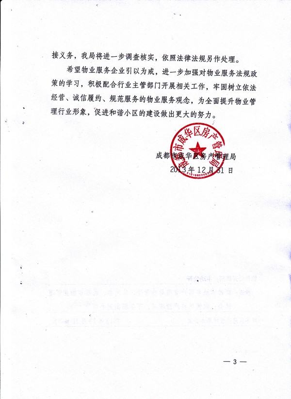 上一條:關(guān)于命名表彰成都市(首批)物業(yè)服務(wù)品牌企業(yè)的決定 下一條:關(guān)于認真做好元旦春節期間物業(yè)管理區域相關(guān)工作的通知