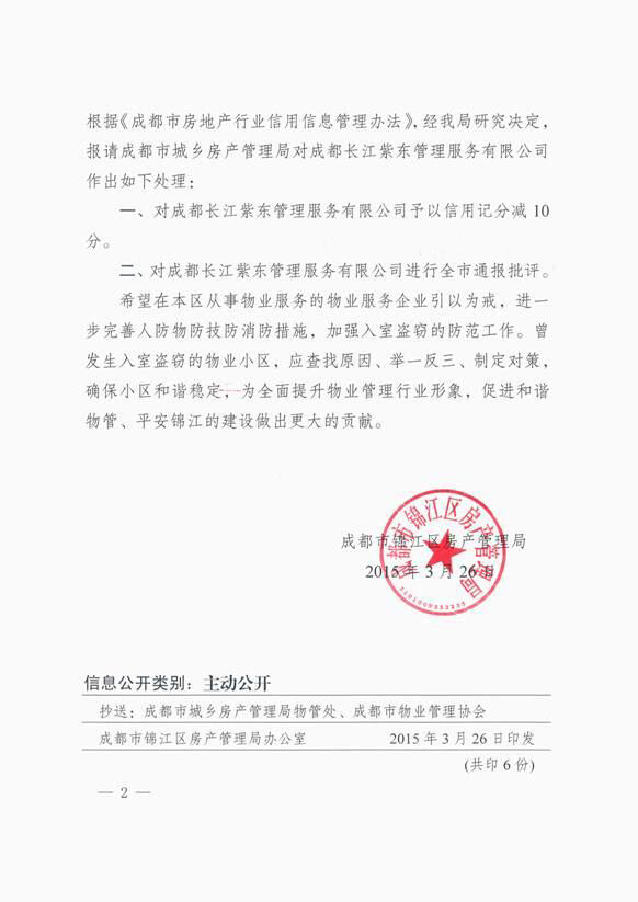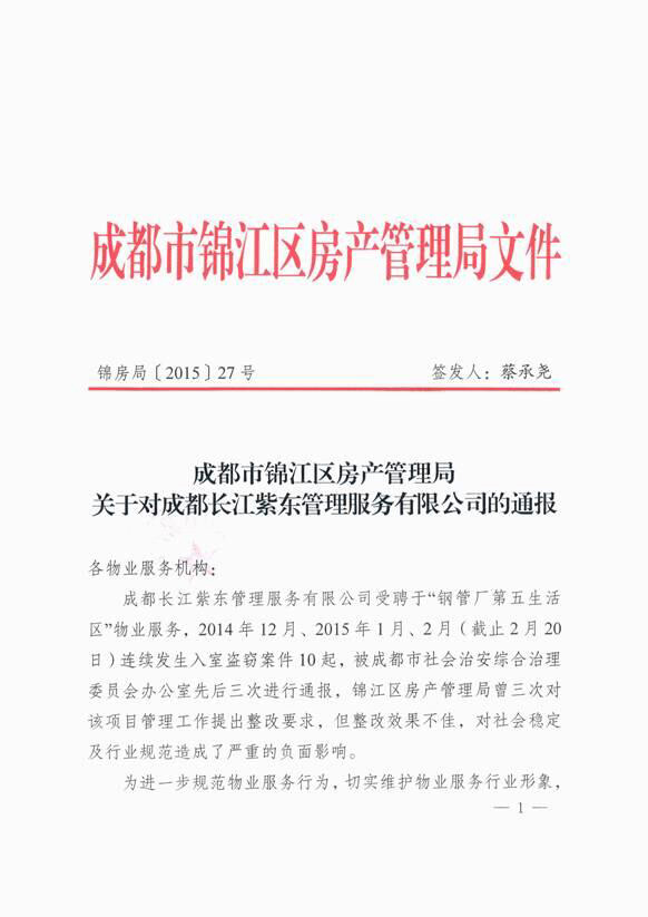 關(guān)于對成都長(cháng)江紫東管理服務(wù)有限公司的通報