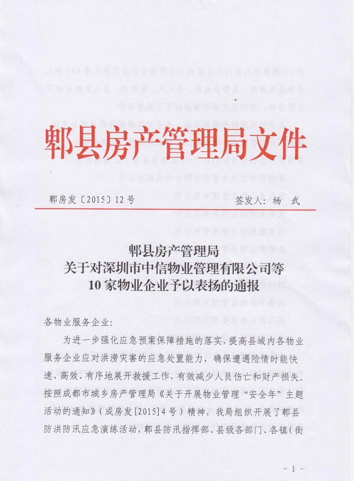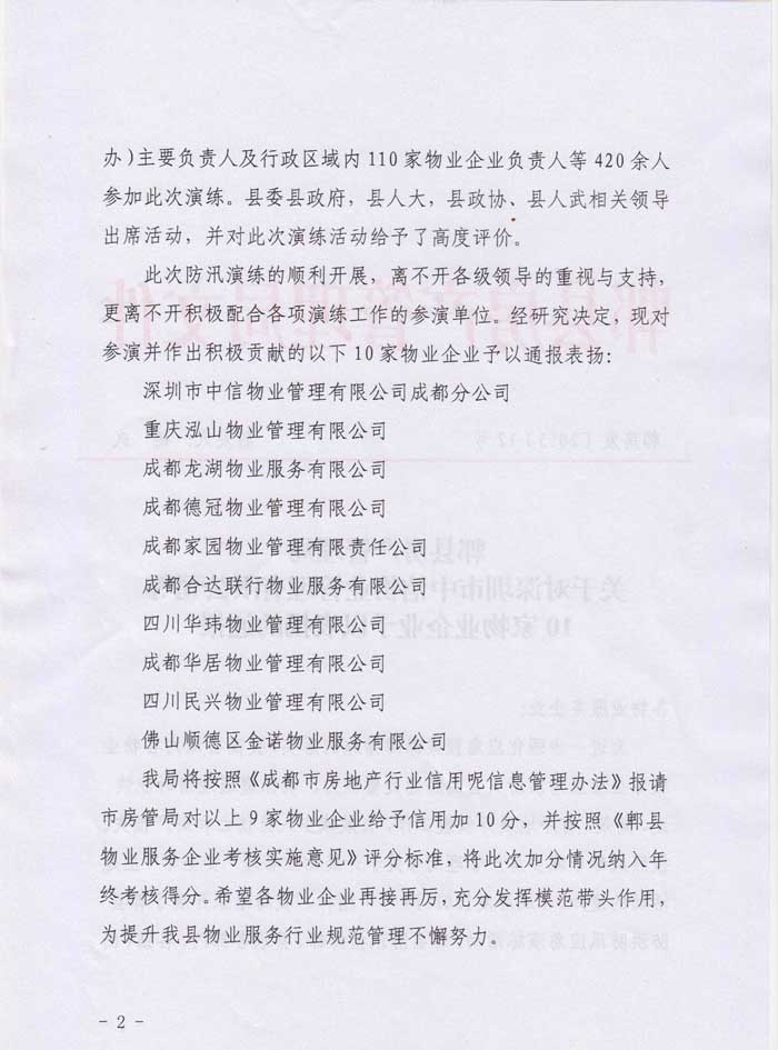 上一條:關(guān)于對成都新和志遠物業(yè)管理有限公司的通報 下一條:關(guān)于對深圳市中信物業(yè)管理有限公司成都分公司予以表?yè)P的通報