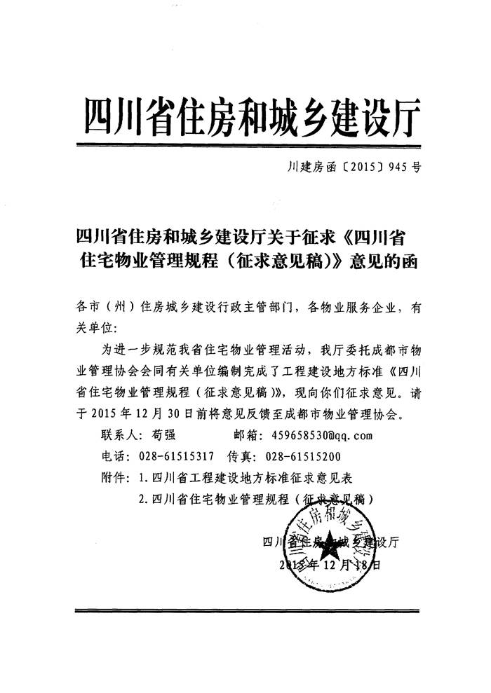 上一條:關(guān)于進(jìn)一步做好歲末年初物業(yè)管理區域安全防范工作的通知 下一條:關(guān)于開(kāi)展成都市培育發(fā)展社會(huì )組織專(zhuān)項資金扶持項目“成都市物業(yè)管理協(xié)會(huì )和諧物管大講堂”行業(yè)免費輪訓的通知